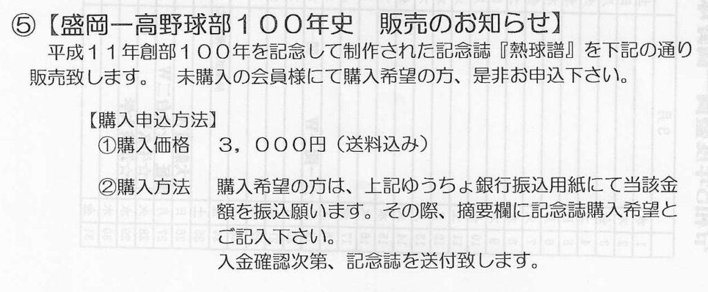 平成11年創部100年を記念して制作された記念誌『熱球譜』を販売いたします。【購入方法】①購入価格 3,000円(送料込み)②購入方法 ここへご連絡ください。ゆうちょ銀行振り込み用紙と記念誌を送付いたします。
